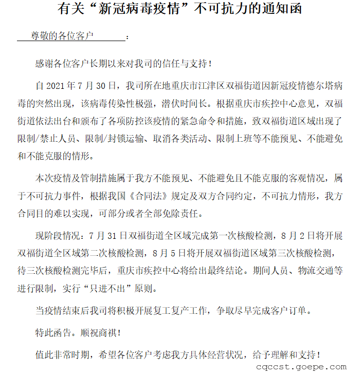 自2021年7月30日,我司所在地重庆市江津区双福街道因新冠疫情德尔塔*的突然出现,该*传染性极强,潜伏时间长。根据重庆市*中心意见,双福街道依法出台和颁布了各项防控该疫情的紧急命令和措施,致双福街道区域出现了限制/禁止人员、限制/封锁运输、取消各类活动、限制上班等不能预见、不能避免和不能克服的情形。